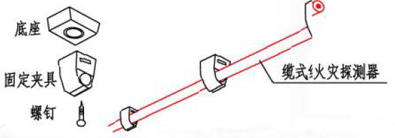 線型感溫火災(zāi)探測器在頂部安裝時(shí),可采用帶底座的卡具、掛鉤等固定。
