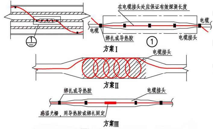 線型感溫火災(zāi)探測器應(yīng)采用接觸式的敷設(shè)方式對隧道內(nèi)的所有的動力電纜進(jìn)行探測;分布式線型光纖感溫火災(zāi)探測器在電纜接頭、端子等發(fā)熱部位敷設(shè)時(shí),其感溫光纜的延展長度不應(yīng)少于探測單元長度的1.5 倍,在電纜接頭處應(yīng)采用方案Ⅱ的方式;光纖光柵線型感溫火災(zāi)探測器在電纜接頭、端子等發(fā)熱部位應(yīng)設(shè)置感溫光柵單元,應(yīng)才用方案Ⅰ、Ⅲ的方式。如圖6 所示: