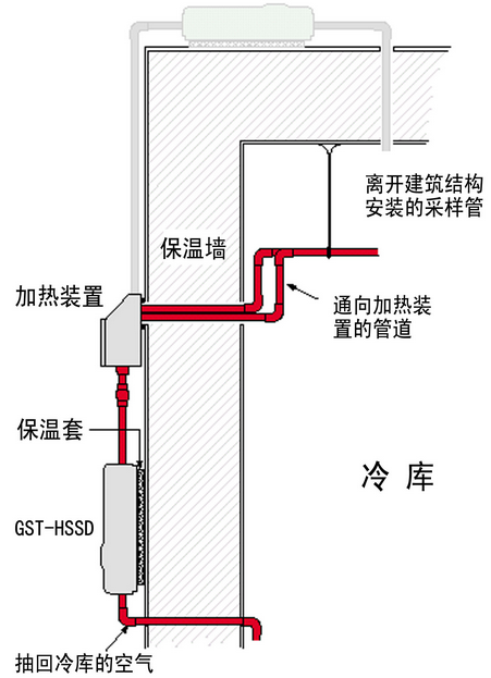 冷庫中采樣管,加熱箱和吸氣式感煙火災(zāi)探測器的相對(duì)位置